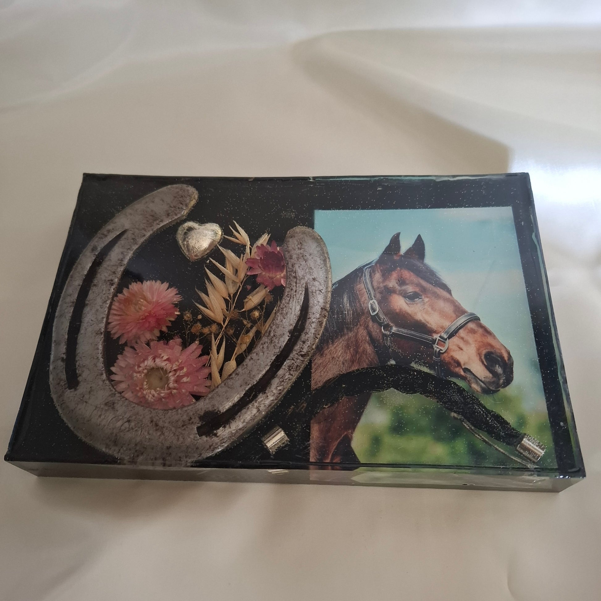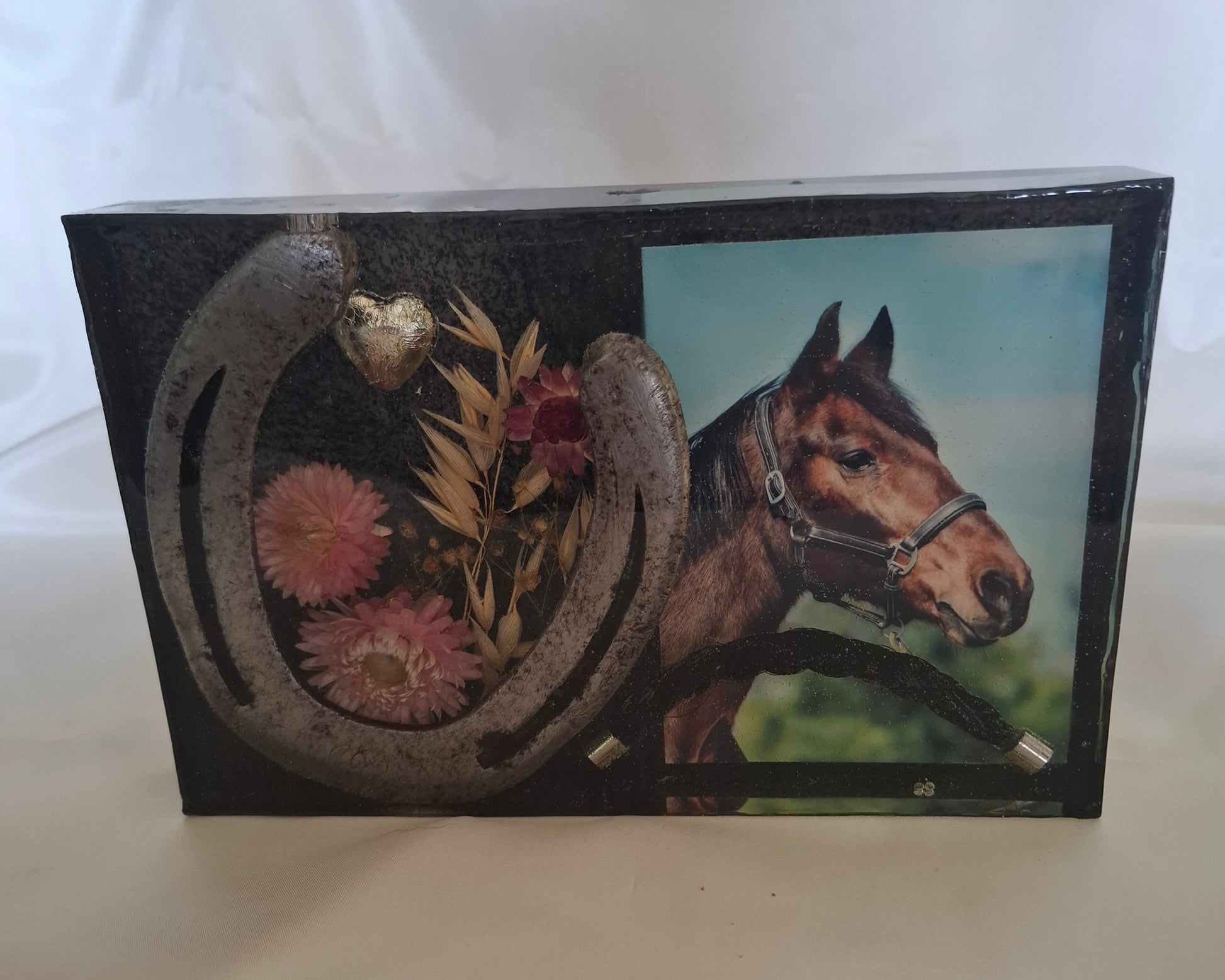Het item op de foto is een voorbeeld, Ik heb deze gemaakt nadat mijn paard overleden is. Met zijn laatste hoefijzer en wat haar en natuurlijk een mooie foto.