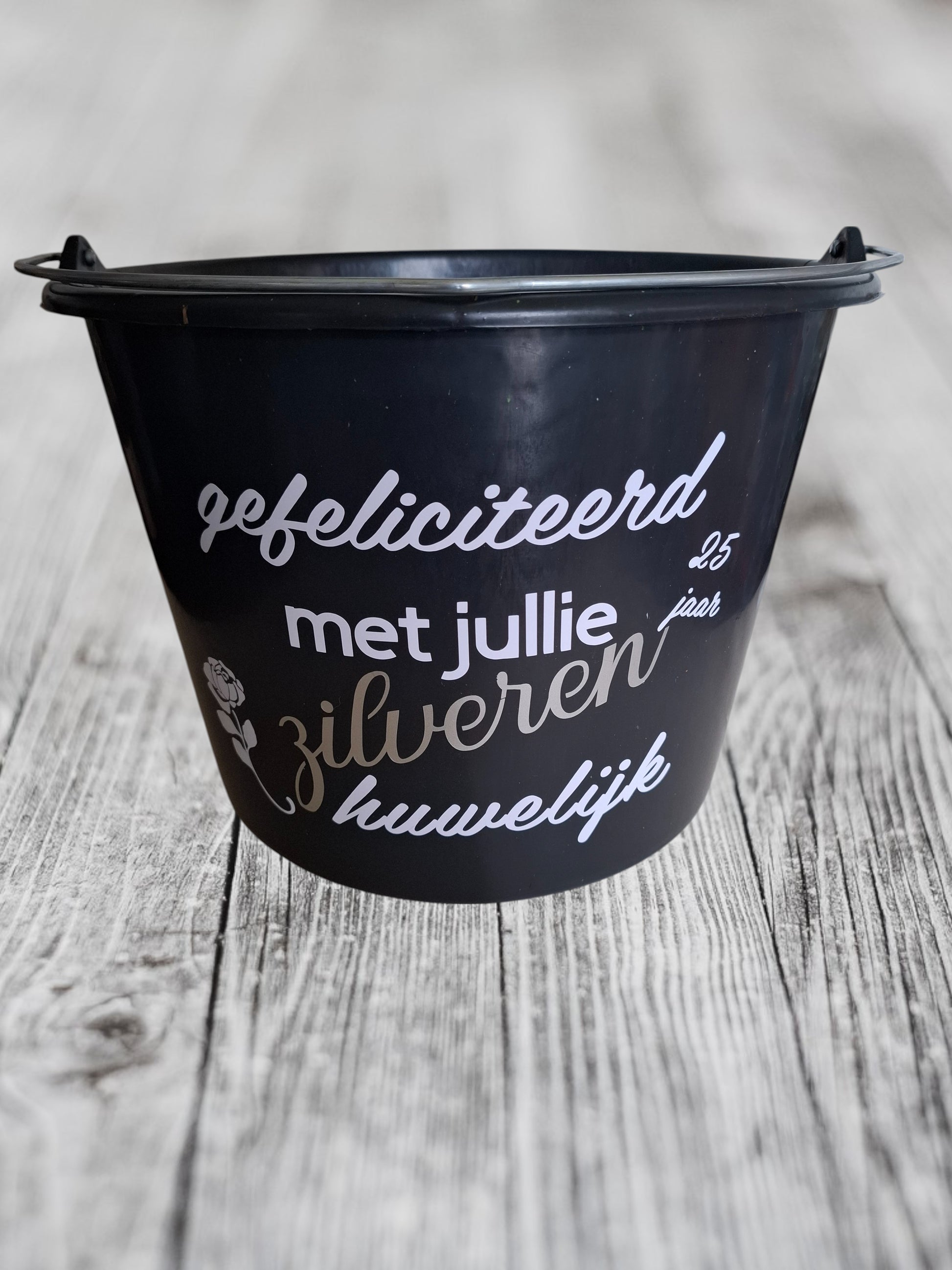 Feetje van een bruidspaar dat 25 jaar getrouwd is, en je weet niet wat te geven. Dan is deze emmer ideaal, te vullen met verschillende dingen. Emmer wordt wel leeg geleverd.